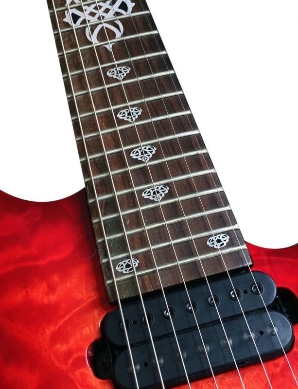 この写真では7弦ギターに貼っていますがもちろん通常の6弦ギターにも対応しています。
