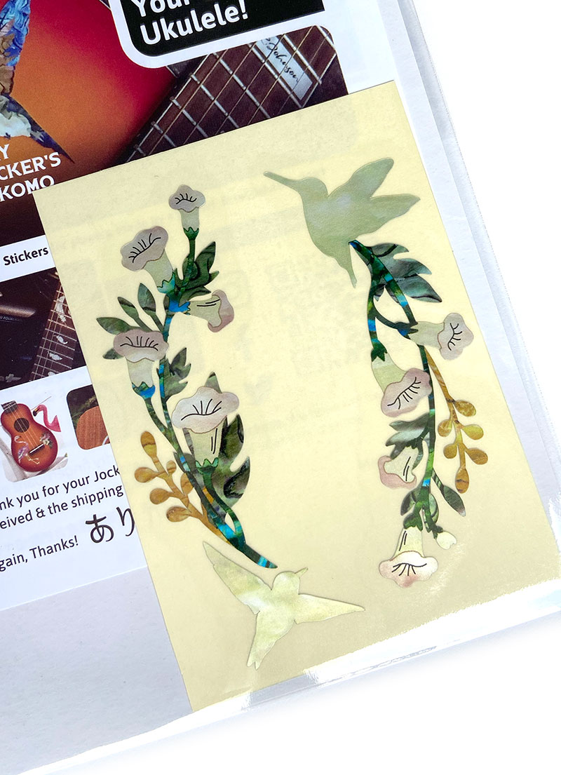 ウクレレのサウンドホール周りに貼るだけで パッと明るくなりました!